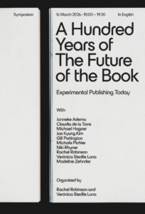 Invited talk, What Kind of Experiment is Experimental Publishing Today? A Hundred Years of the Future of Books. The Institute for Cultural Inquiry, 16 March 2026, Berlin. Organised by Rachel Robinson (Lecturer in Spanish and Latin American Studies, University of Galway) and Verónica Stedile (Postdoctoral Fellow, ICI Berlin). https://www.ici-berlin.org/events/a-hundred-years-of-the-future-of-the-book/